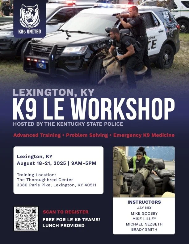 The four-day workshop, hosted by the Kentucky State Police and provided by K9s United at no cost to attendees or their agencies, will bring together 60 K9 teams from across Kentucky, Georgia, Indiana, Michigan, Missouri, North Dakota, Ohio, Pennsylvania, South Carolina, and Tennessee.